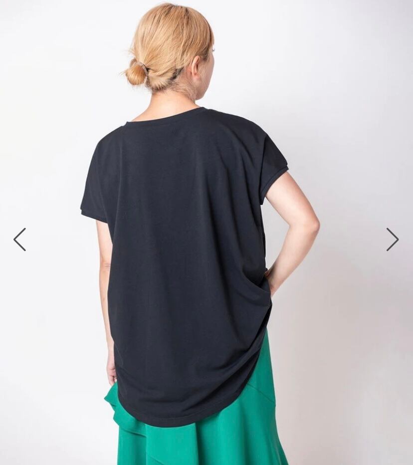 ラウンドヘムとスリットがラインをきれいに見せ、さりげなく体型カバーも。